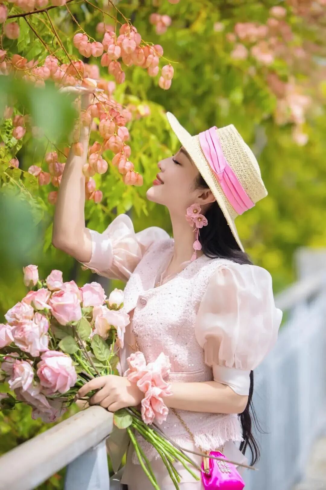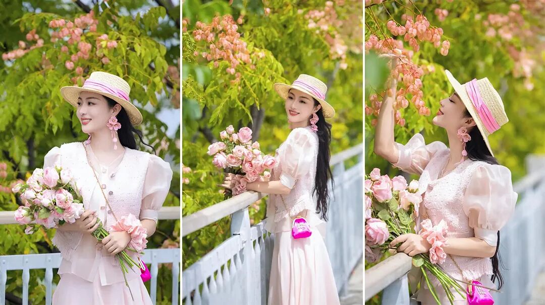 以栾树为背景微微侧身,一手持花轻放胸前,一手轻抚帽檐。开启手机人像模式,虚化杂乱背景,画面瞬间变得唯美柔和,每一张都似油画般精致。