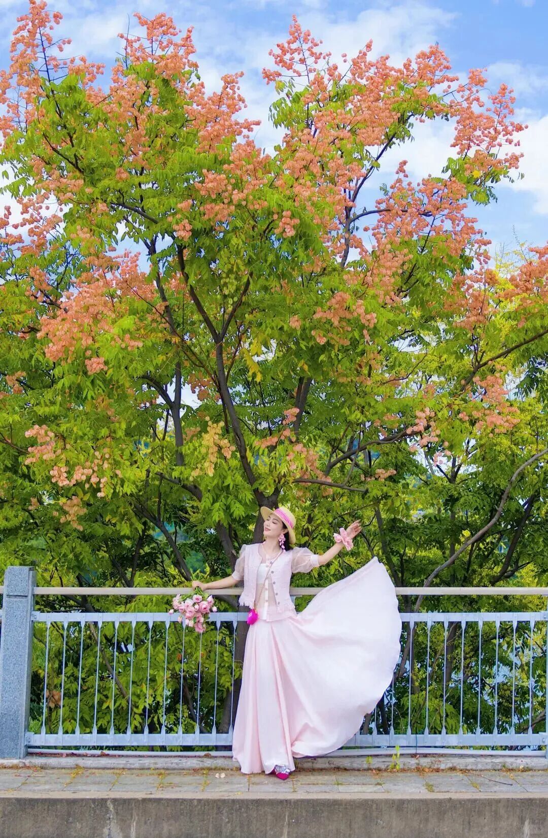 桥面俯拍或阶梯仰拍皆是绝佳角度——人立于旋转楼梯间,以栾树为背景,搭配草帽、草编包与花束点缀,秋意与氛围感瞬间满溢,每一张都似在讲述秋日童话。