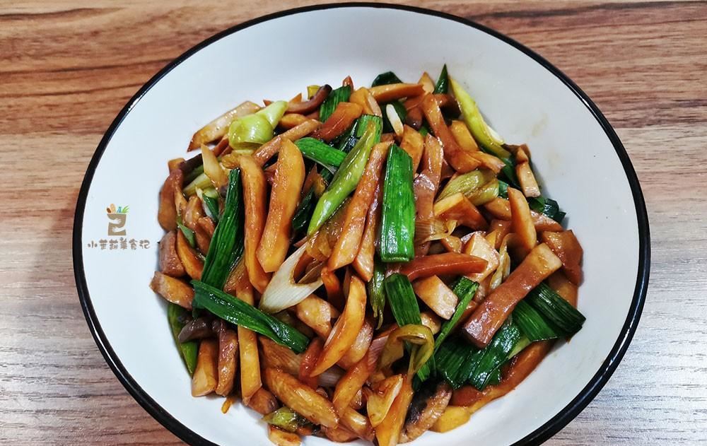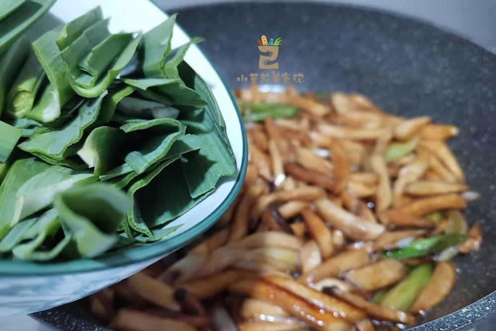 4、起锅烧油,先把青蒜蒜白的部分放到锅里炒香,放入杏鲍菇,淋入生抽炒入味,接着把蒜叶的部分也下锅快炒,直到蒜叶也断生,就可以关火出锅了。