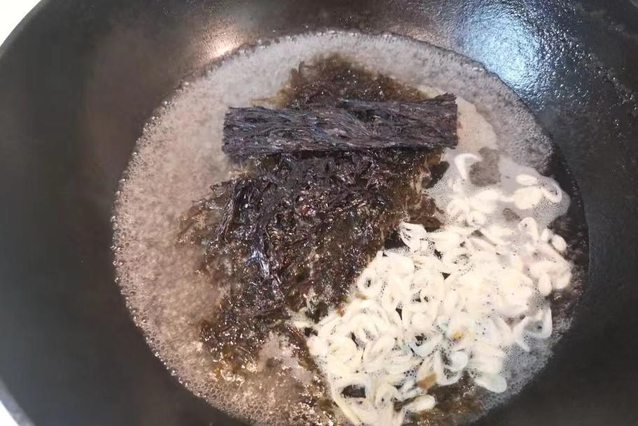 2、锅里倒入饮用水烧开,先把紫菜和虾皮放进去,煮两三分钟,这样汤汁会比较鲜,而且有一个底味在里边。