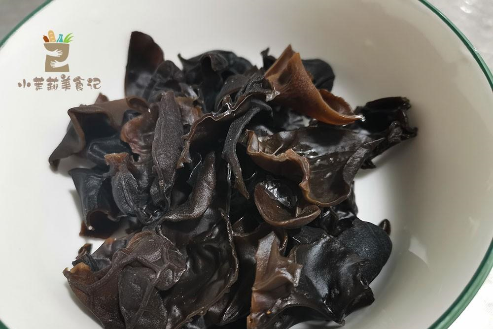 1、提前抓一些干木耳放到碗里边,多放些水,这样更利于木耳的快速泡发。待木耳吸水膨胀之后,我们将其仔细揉搓,把杂质脏东西搓掉,然后剪掉根部。