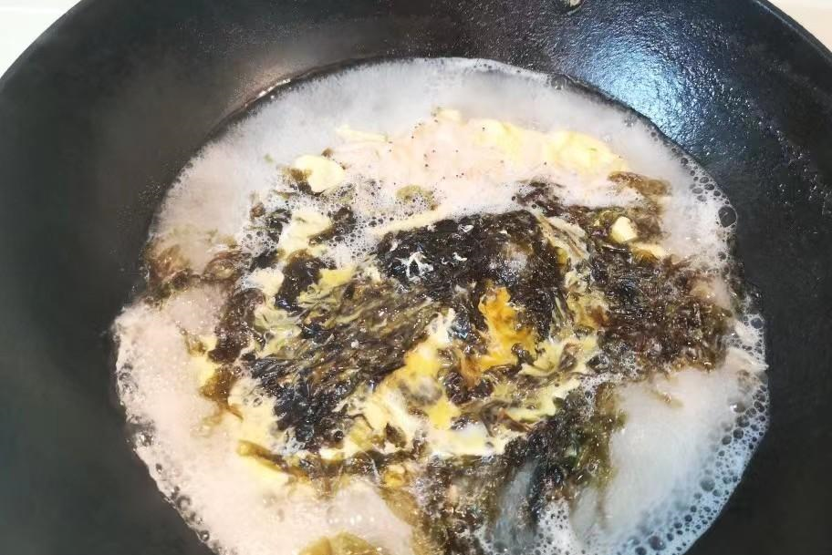 3、接着我们把蛋液淋到水里,先不要去搅拌,自然而然形成大的蛋花即可。盛入碗中后,撒上葱花,这时候可以点一点芝麻香油来增香。