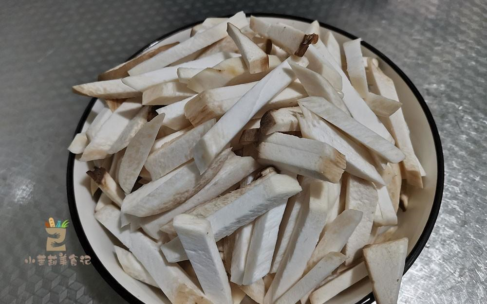 2、准备两根中等大小的杏鲍菇,将根部比较老的部分切掉,接着放到温水里边,搓洗净,然后切成条。
