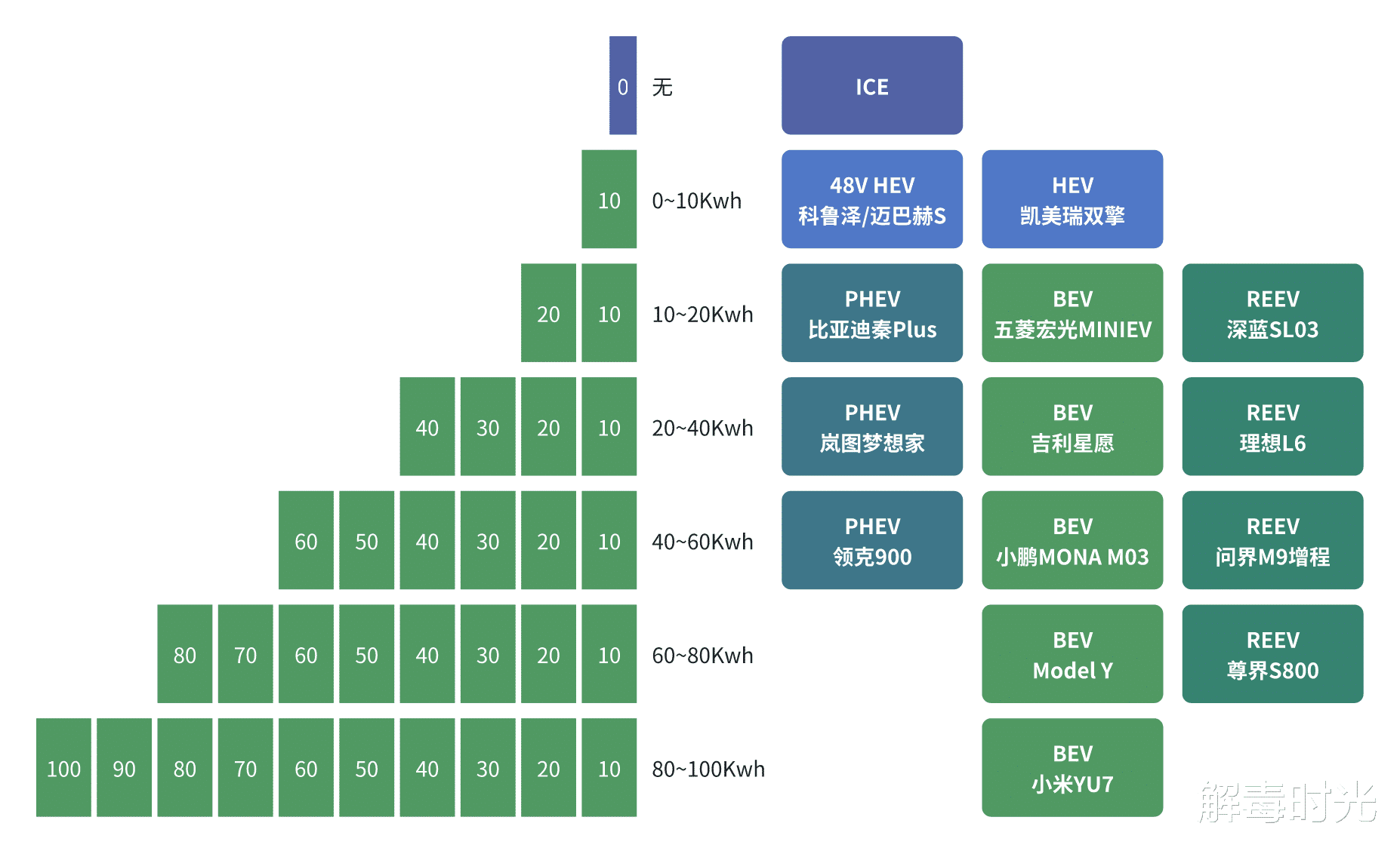 如果想要更简单的看待市场,就可以从油和电最重要的区别,即“电池含量”来对整个新能源市场进行一个扫描,可以发现一些有趣的现象,可以说经过数年高速的发展,中国汽车市场已经形成了其特有的“生态位”结构。
