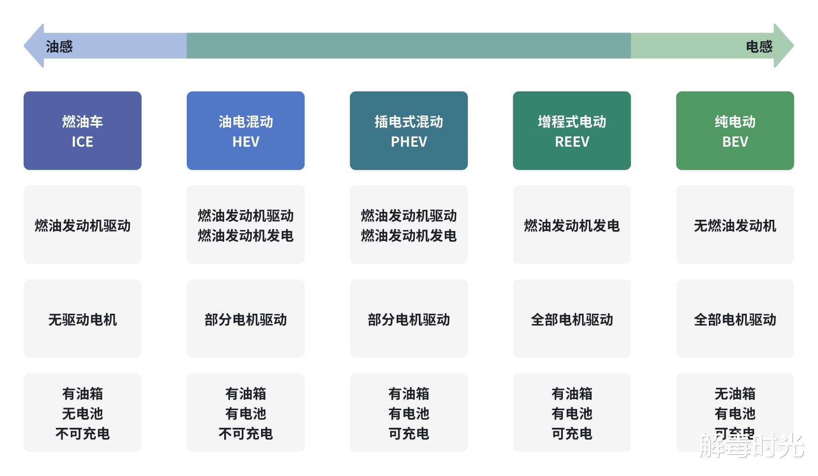 在探讨长纯电续航增程车之前,简单的看一下中国乘用车市场的能源形势现状,如果按照油和电的比例从 0 到 100 来划分的话,存在着油车(ICE)、油电混动(HEV)、插电式混动(PHEV)、增程式电动(REEV)、纯电动(BEV)。这其中油和电的最大的几点区别就是电感加速快、安静、用电成本低,而油感加速均匀且没有里程焦虑。