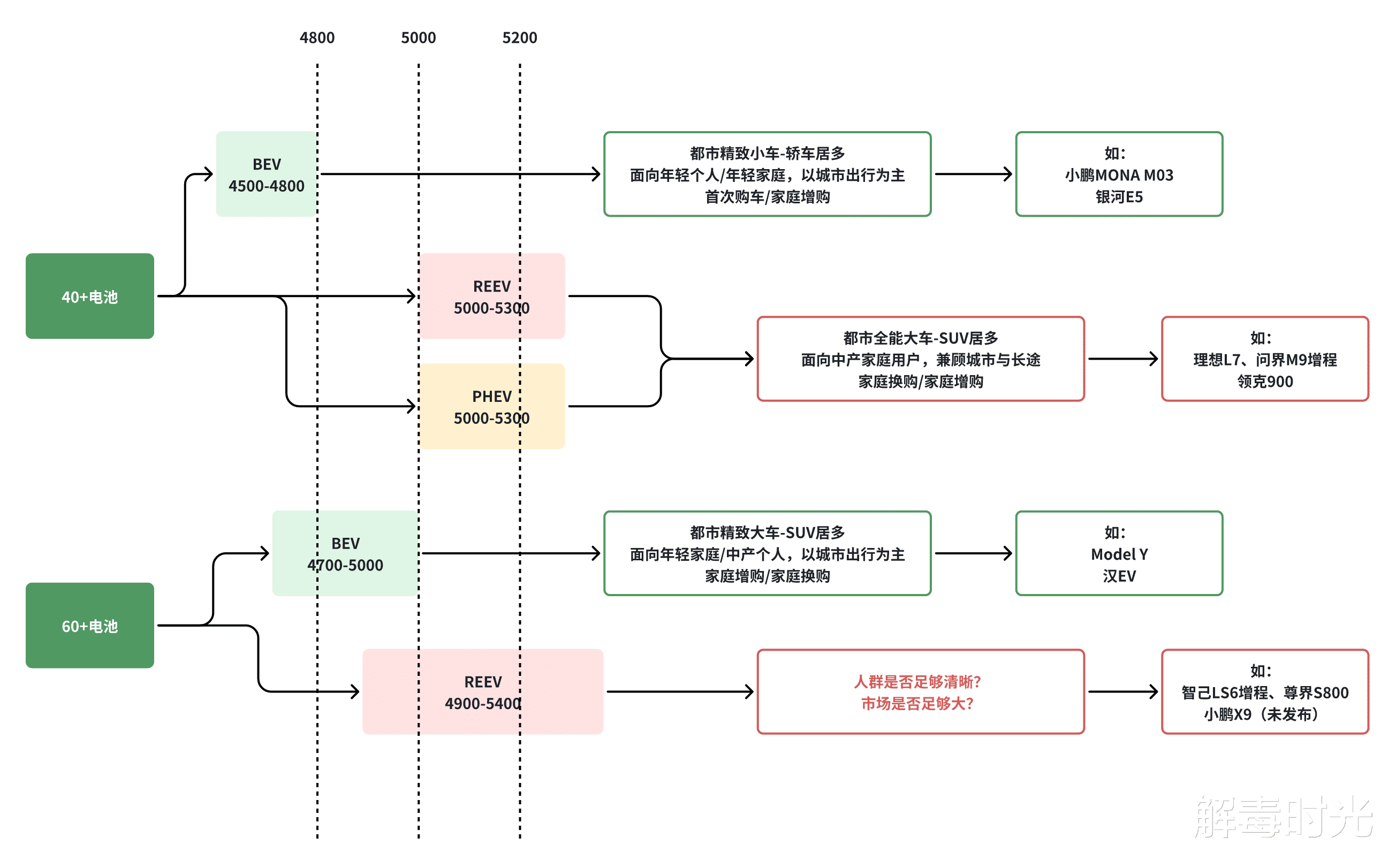 那么 60 度电的增程车,如果不做的更大,还在一个跟 40 度电一样大的车身当中,首先不会带来充电的频率的核心体验提升,其次在里程焦虑上也没有本质变化,也没有空间价值的体现,但又投入了更多的电池成本,就会变成一个不太均衡的产品。