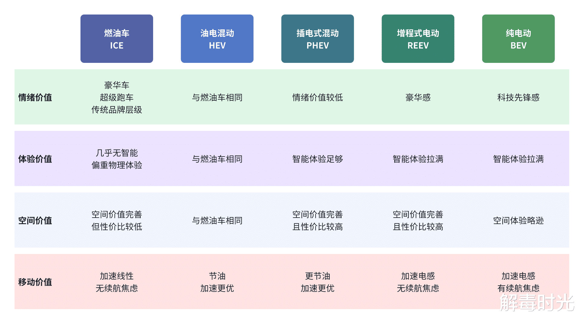基于汽车价值的四个维度,或者说是汽车用户的“马斯洛需求层次”来看不同能源类型的产品的时候,就可以总体上对这些产品有一个综合的认知:传统燃油车一部分具备原有的豪华车的价值优势,核心还是在续航焦虑方面优于电车;混动车更像油车,但有了一些智能体验以及燃油经济性更好;增程式电动车智能体验很好,也没有续航焦虑,空间价值也足,是一个看起来均衡的产品;纯电车具备科技感,智能体验和加速非常好,但空间和续航焦虑是弱项。