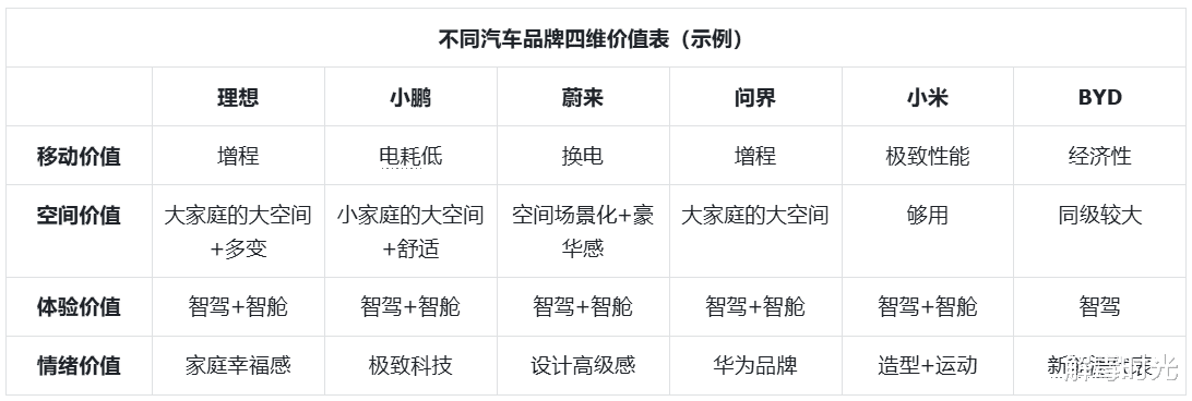 通过简单的分析,我们首先得到了汽车价值的四个维度。在这四个维度之下,有很多汽车属性的支撑,比如在移动价值方面,加速性、操控感、安全性等都是重要的因素;空间价值当中,载人空间和储物空间都是关键项;体验价值中传统的细节体验和服务体验之外,如今又增加了智能驾驶和智能座舱的体验;最后情绪价值比较难以定性,更多的是来自于汽车的美观程度、品牌认同感、社会舆论等因素构成。这些价值,最终通过产品还会传递给汽车的品牌,比如理想汽车的大空间,蔚来的灵活换电无焦虑,问界的智能体验,小米的极致驾驶感受以及比亚迪的高经济性等。