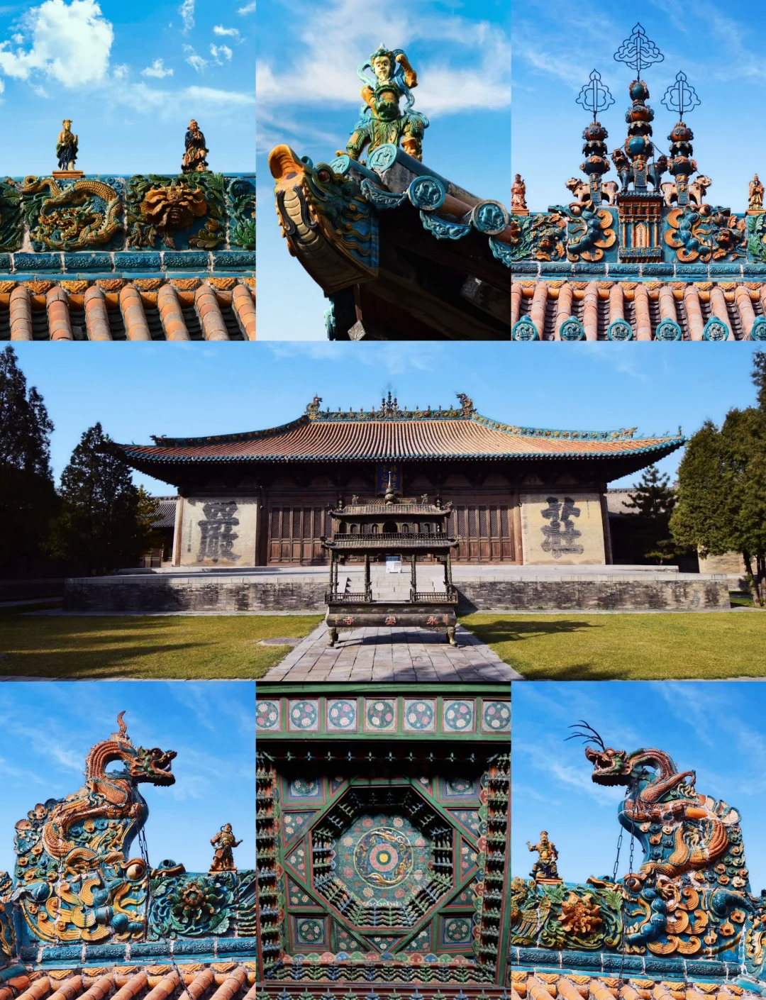 传法正宗殿·壁画巅峰:元代原构,殿内壁画面积达180平方米,分“儒释道三教神祇”“地狱轮回”“人间百态”三部分,重点看“十大明王”怒目金刚像(肌肉线条用“铁线描”勾勒);