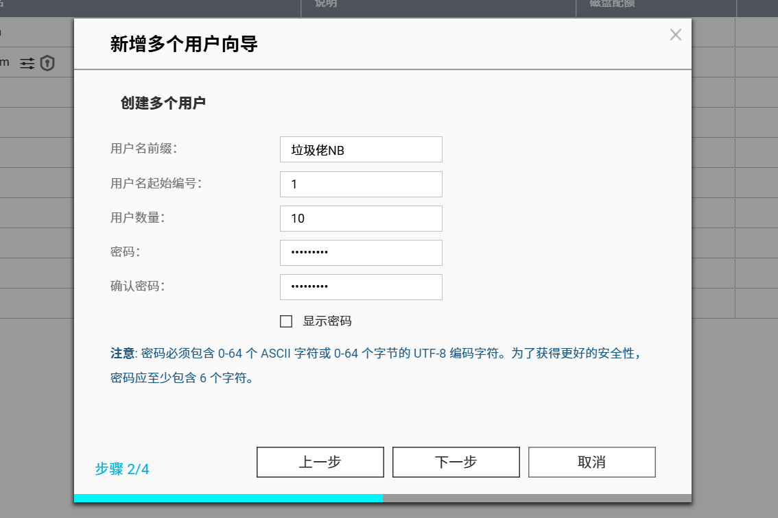 ▼有了精细化的用户管理,我们可以批量进行用户创建,我们甚至可以给每个用户设置不同的可用空间在海鲜市场上【出租】我们的NAS。创建过程中可以要求用户首次登录必须修改密码,或者是账号到特定日期自动停用,这都是能够提升商用NAS安全性必备的功能。