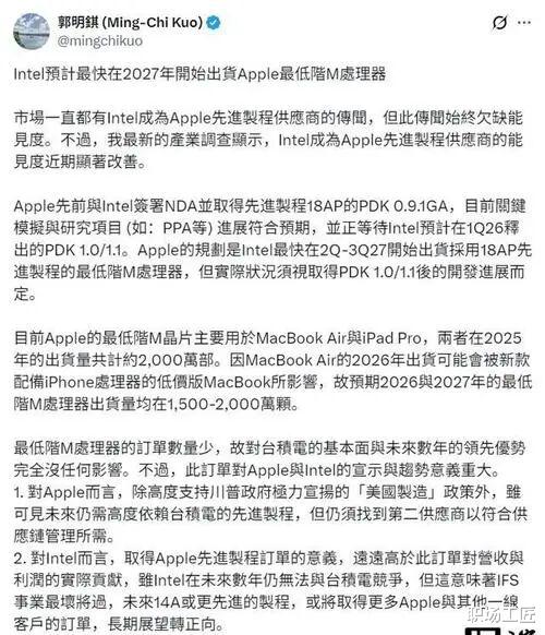 知名分析师郭明錤透露,英特尔计划最早在2027年开始为苹果的M系列芯片供应最低端的处理器。