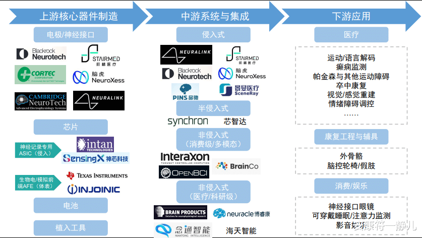 上游硬件:关注柔性电极供应商(如迈普医学)、专用芯片厂商(如寒武纪)、手术机器人企业(如天智航);