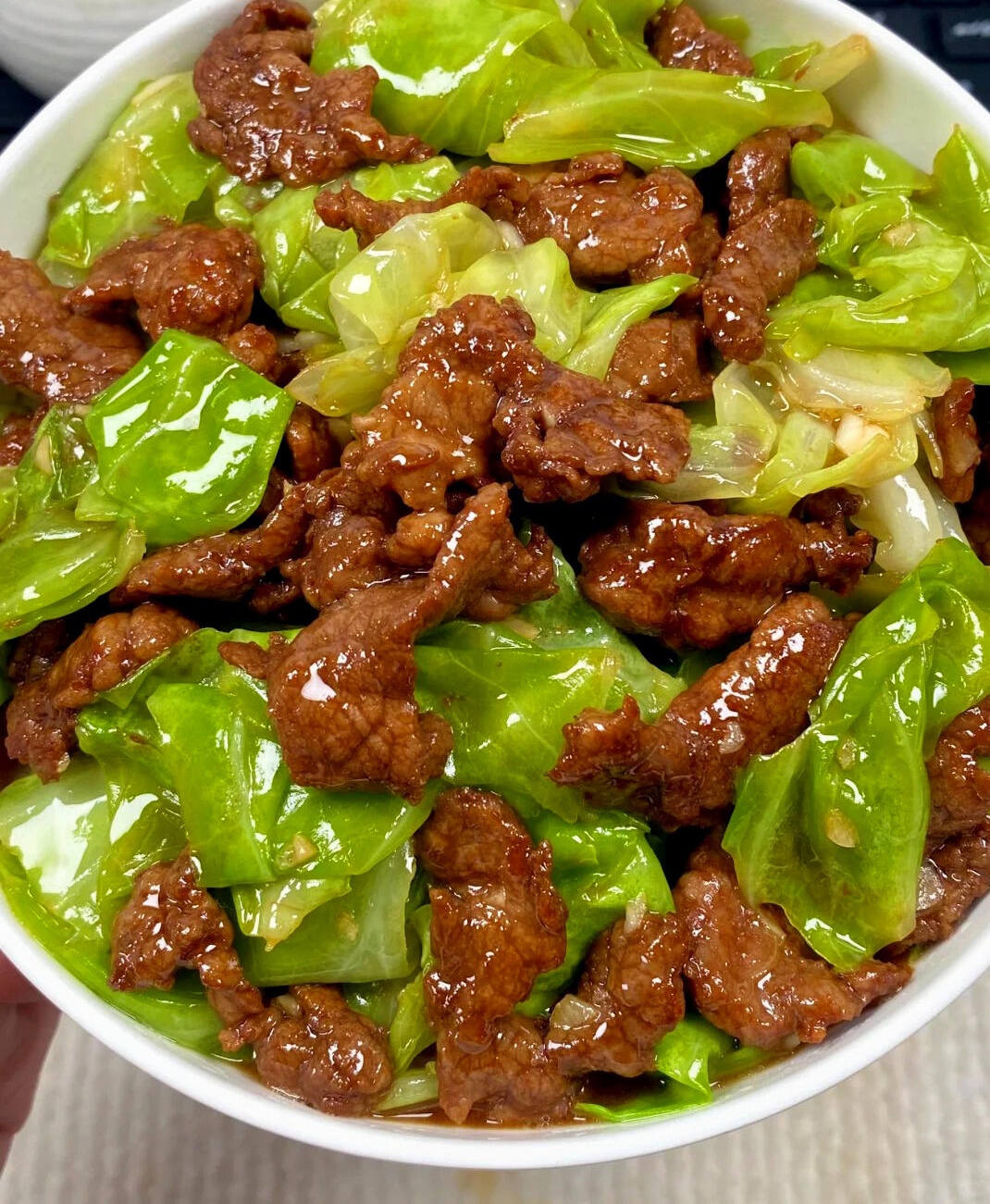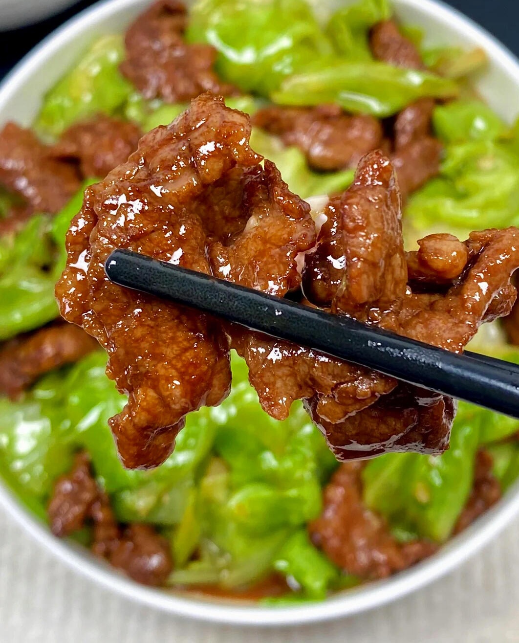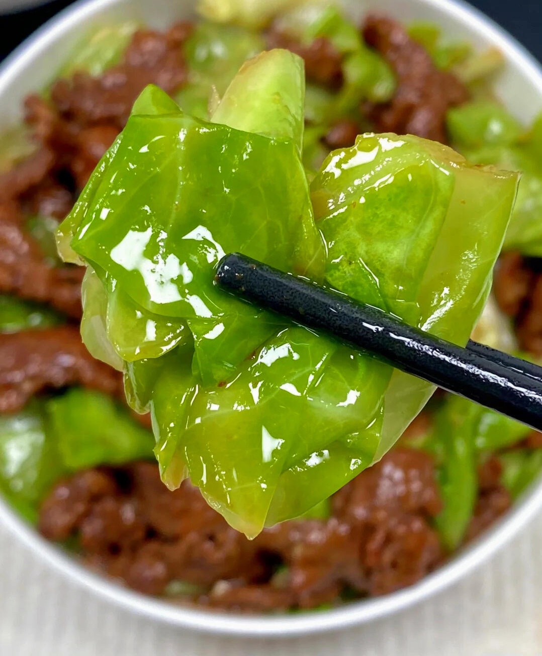 把做好的牛肉炒包菜盛出来,放在盘子里。那鲜嫩的牛肉配上清脆的包菜,看起来就特别诱人。夹起一块牛肉放进嘴里,鲜嫩多汁,包菜的清脆和牛肉的鲜香在嘴里交织,简直是绝配!这道牛肉炒包菜,不仅简单易做,而且超级下饭,每次做这道菜,米饭都能多吃两碗。