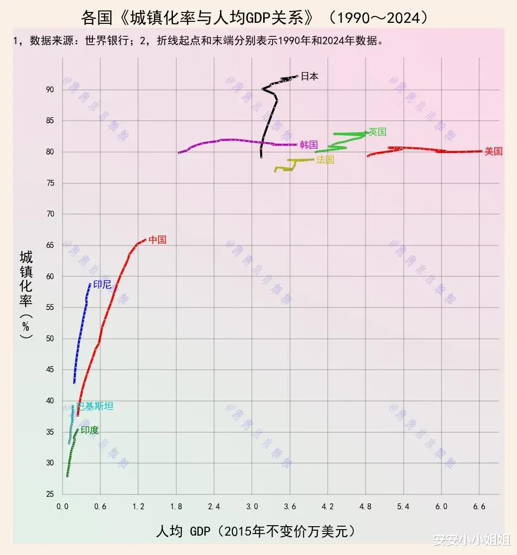 图表中,韩国的轨迹尤为典型。其在城镇化率超过80%后,人均GDP仍持续增长,但城镇化率几乎停滞。