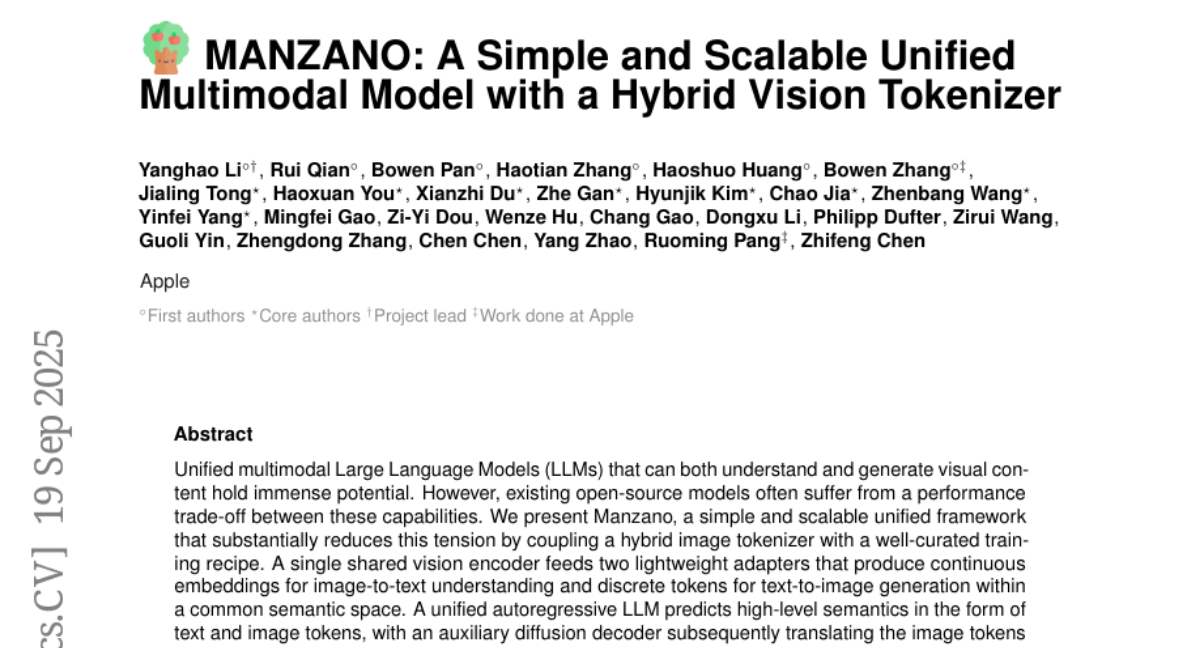 这项由苹果公司的李杨昊等研究团队开发的突破性AI模型研究发表于2025年1月,论文题目为《MANZANO: A Simple and Scalable Unified Multimodal Model with a Hybrid Vision Tokenizer》。有兴趣深入了解的读者可以通过arXiv:2509.16197访问完整论文。这是苹果公司在AI领域的一次重大突破,展现了其在多模态人工智能方面的雄厚技术实力。