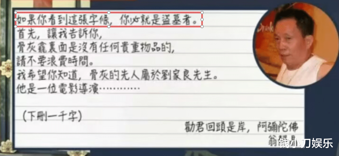 当初给刘家良办理后事的时候,翁静晶就未雨绸缪的在刘家良的墓里放了一张字条,字条上写着: