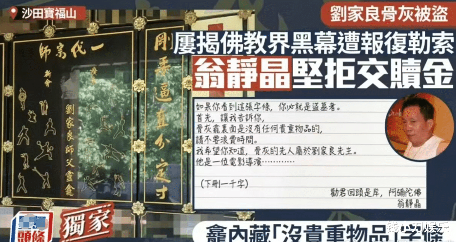 更让人震惊的是,此次刘家良骨灰被盗并不是个案,还有至少2-3位名人骨灰被盗,家属遭勒索数千万港币。