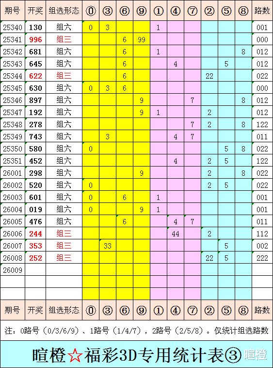 26009期:暄橙福彩3D综合条件(本期将在1月9日21:15开)一、上期回顾 ☆1、上期开奖号:2 5 2。2、和值= 9,跨度= 3。3、组三形态,222路组合。4、热度分布(热:温:冷)2:1:0。二、本期条件 ☆1、三期缺码:016789。2、热:0245,温:136,冷:789。3、断组分解式:2378//014-569。4、四胆:2678;三胆:267。三、术语解释 ☆1、三期缺码:0至9这十个自然数当中,未在近三期开奖号出现的数字。2、热度(热温冷):自然数0至9,在近七期开奖号中,出现3次及3次以上的数字,称为热码;出现2次的数字,称为温码;出现1次和未出现的数字,称为冷码。某个数字在开奖号中出现几个,就按几次计算。3、断组分解式:将0至9这十个自然数,分成三组数字,从前往后依次为A组(4码)、B组(3码)、C组(3码),一般情况下,有一组数字不出码,偶尔会有两组数字不出码。A组不出码的情况相对较少。断组为主,分解为辅。4、常态组六号码:同时包含大数、小数、奇数、偶数、质数、合数的组六号码,共有72注。统计表中,简称“常态”。5、非常态组六号码:全大数、全小数、全奇数、全偶数、全质数、全合数等六种形态的组六号码,共有48注。统计表中,简称“非常”。★提醒:彩市有风险,参与须谨慎!水平有限,仅供参考!