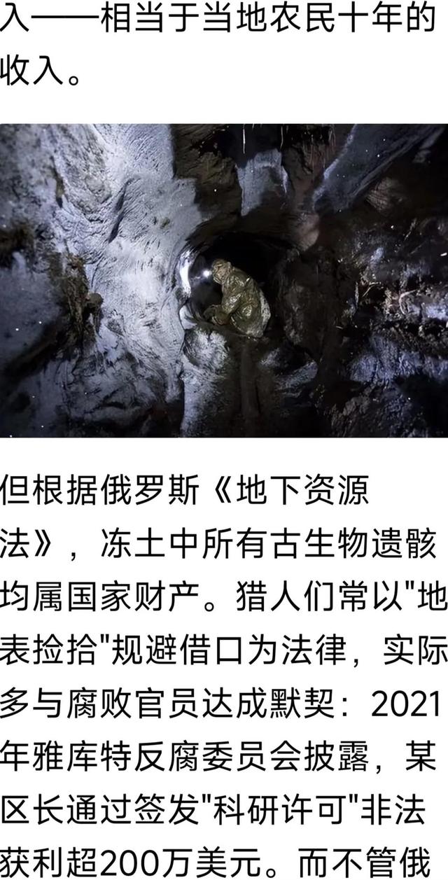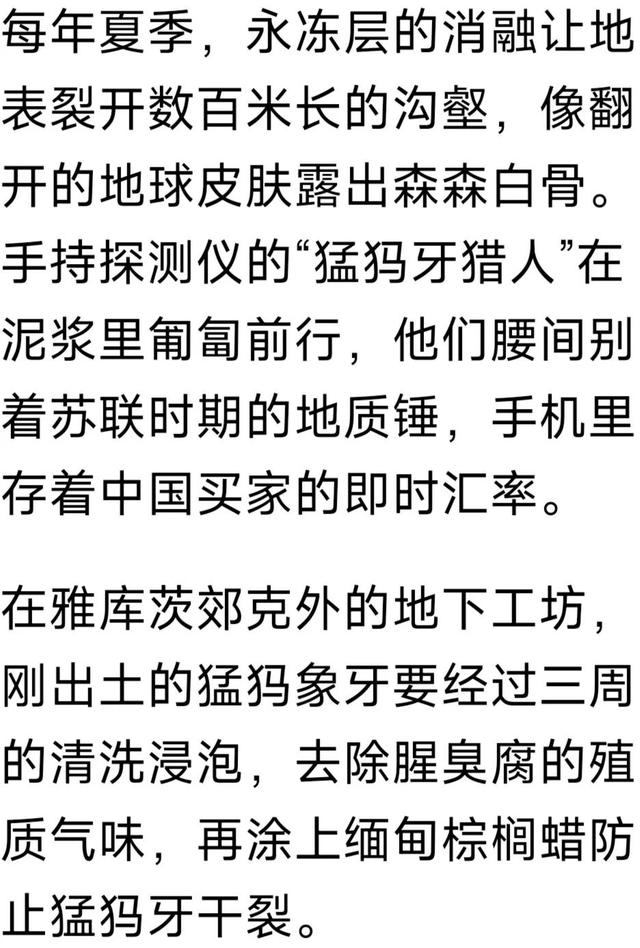 这几年文玩猛犸象牙突然火起来,俄罗斯往国内哈尔滨关口每天都有大量原牙等着检验进关,中国的猛犸象牙每年进口量高达十来亿元。巨大的利润诱惑大量雅库特农民离开农场,前往人迹罕见的原始森林寻觅猛犸原牙。但是寻找和挖掘过程异常凶险,据俄罗斯联合报披露,长期从事猛犸象牙挖掘工作,寿命会比普通人短13年左右。