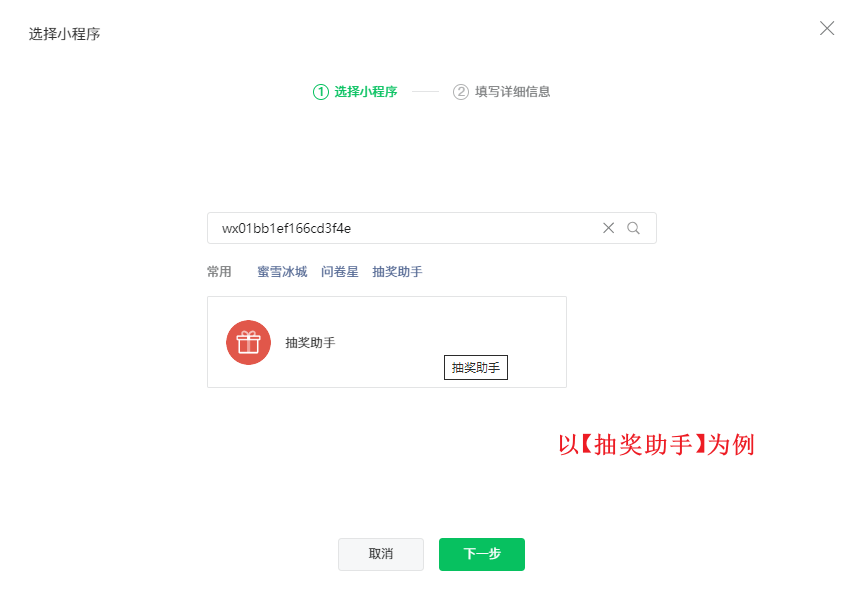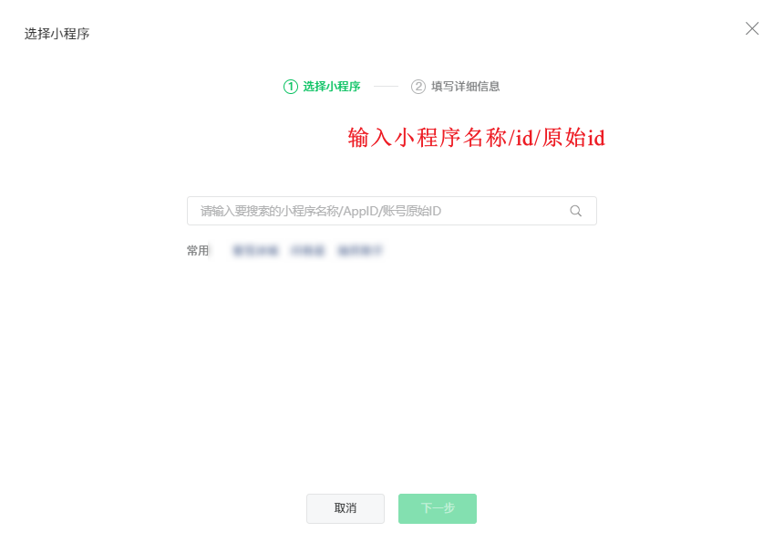 第二步,点击顶部小程序按钮,在弹出的页面中输入小程序名称搜索,如下图所示;