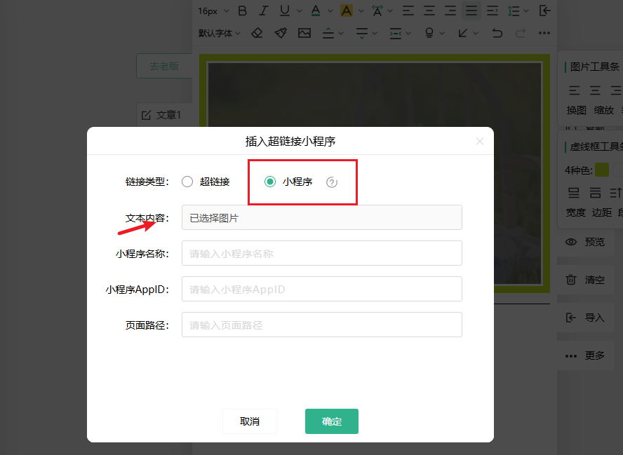 一、打开小墨鹰编辑器,选中需要添加小程序的内容,点击顶部导航栏插入超链接。
