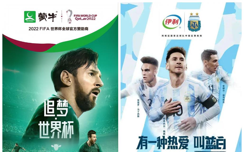 以往大家更关注耐克与阿迪达斯、可口可乐与百事可乐等“老冤家”如何交锋,而在本届卡塔尔世界杯,不少球迷的目光或许被我国两大乳业巨头——蒙牛vs伊利给吸引了。本届世界杯,蒙牛是官方赞助商,并签约梅西和姆巴佩作为官方代言人;似乎是相对应的,伊利签约了C罗、内马尔、甚至刚刚拿下金球奖的本泽马(因伤缺席本届杯赛)。此外,伊利还一举签下阿根廷、葡萄牙、德国和西班牙四支球队,可谓“全副武装”迎战蒙牛。