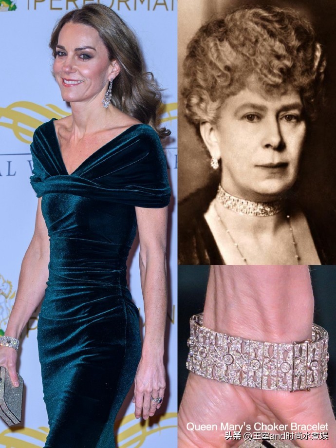 在珠宝首饰上,凯特王妃佩戴了伊丽莎白女王的格雷维尔吊灯钻石耳坠以及玛丽王后的钻石手镯,虽然都不是第一次佩戴了,但是搭配这袭金丝绒裹身裙,更显光彩照人,优雅贵气。