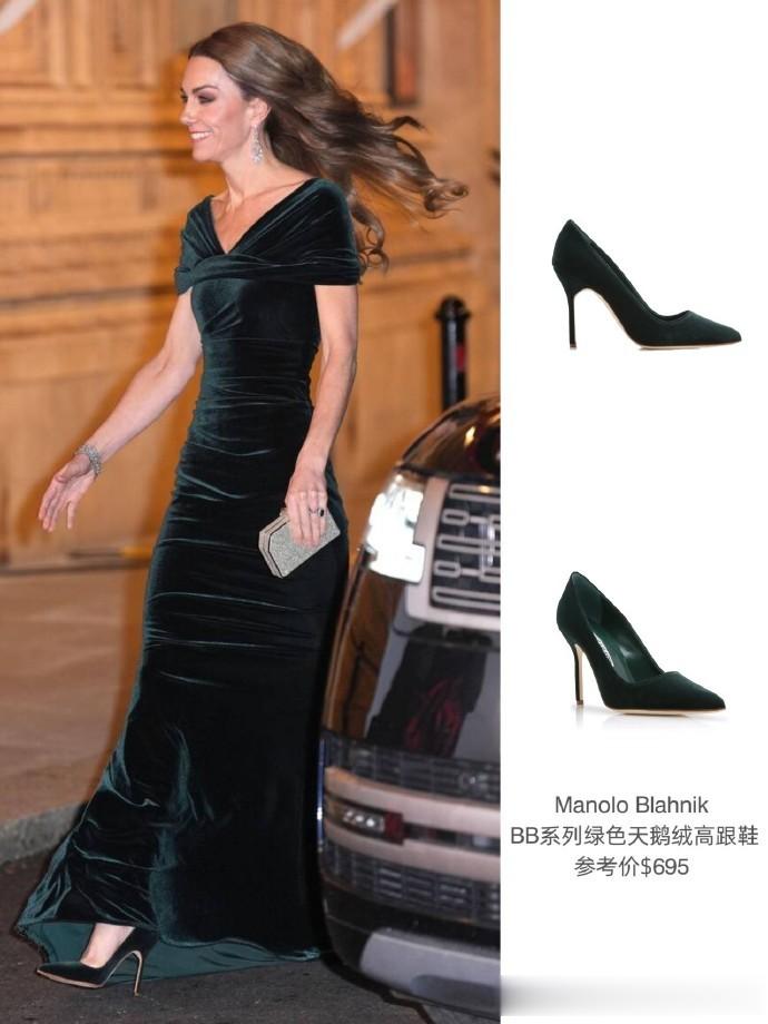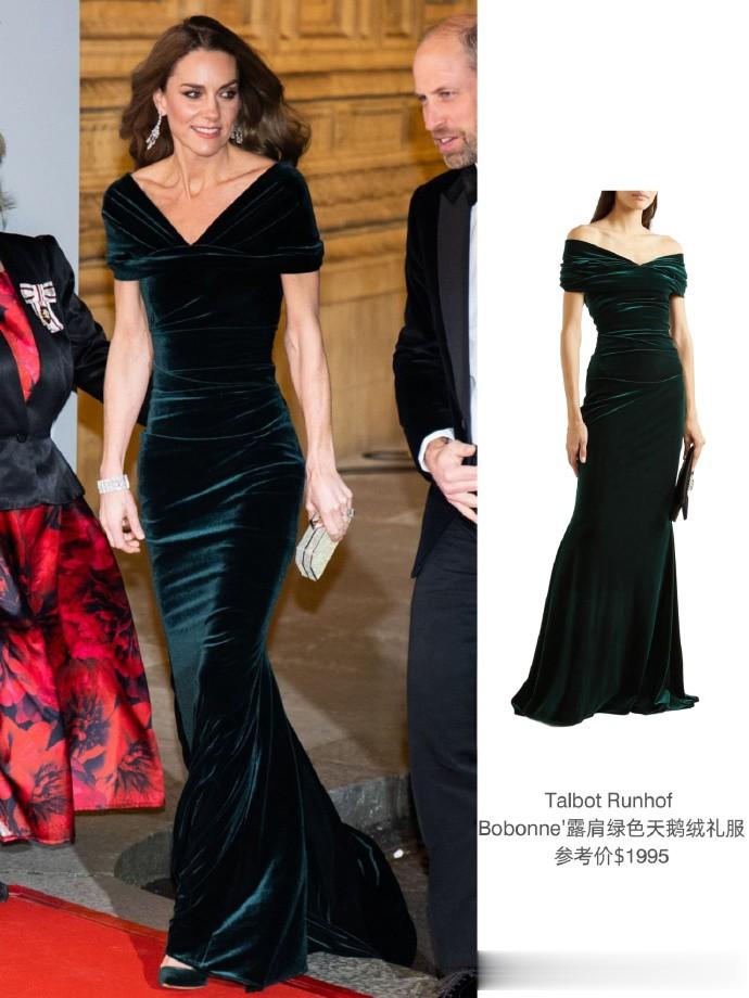 凯特王妃这次选择的了一袭来自德国的品牌——Talbot Runhof,一袭墨绿色丝绒鱼尾裹身裙,踩着细细的同色丝绒高跟鞋,优雅又时尚。