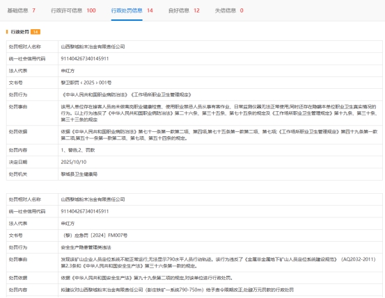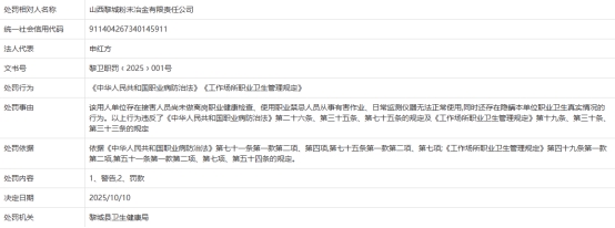 在职业病防治方面,该公司同样存在严重违规。2025年10月,黎城县卫生健康局查实,公司存在接害人员未做离岗职业健康检查、安排职业禁忌人员从事有害作业、职业卫生日常监测仪器无法正常使用且隐瞒真实情况等行为,违反《中华人民共和国职业病防治法》《工作场所职业卫生管理规定》,被依法作出警告并罚款的行政处罚。