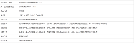 经查,该公司的违法违规行为集中在安全生产核心领域。2024年9月,黎城县应急管理局在检查中发现,其彭庄铁矿一系统存在人员定位系统无法正常运行、通风及开拓系统图纸与实际不符等问题,违反《中华人民共和国安全生产法》相关规定,被分别处以4万元罚款;黄崖洞铁矿部分电气设备未取得矿用安全标志、通信电缆连接不规范,被处以4.5万元罚款。更严重的是,2024年6月,该公司二分公司发生生产安全事故造成1人死亡,因违反安全生产主体责任相关规定,被处以10万元罚款。此外,2023年至2024年间,该公司还因尾矿库堆筑不规范、矿井通风量不达标、安全监测监控系统运行异常、特种作业人员未持证上岗等问题,多次被责令限期改正并累计罚款超20万元。