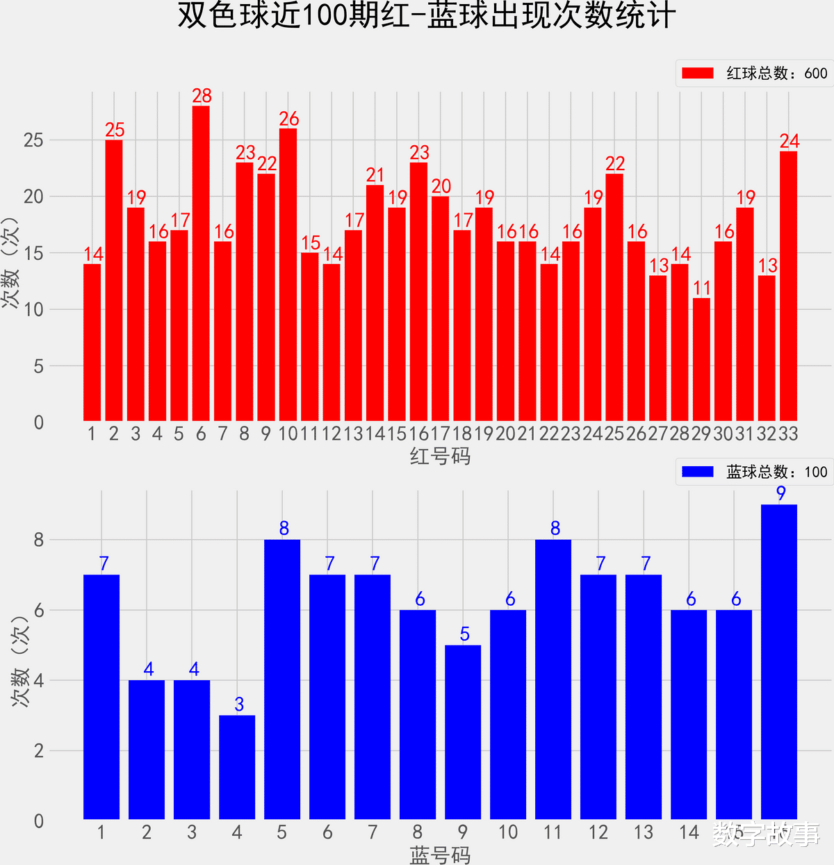 双色球近100期红蓝号统计情况统计样本数据: 600个红球 100个蓝球