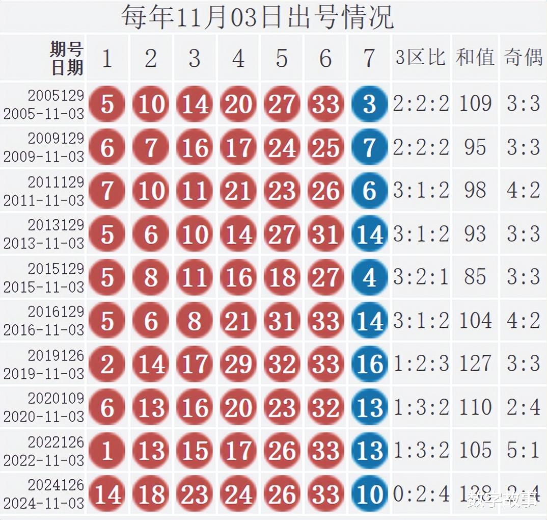 【其他历史数据查询统计】双色球历史上的今天2025-11-03 星期一 双色球不开奖每年11月03日出号情况: