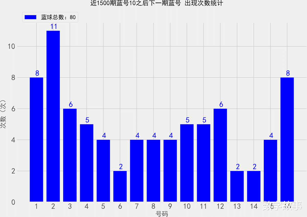统计近1500期蓝号10之后, 各蓝球的出现次数双色球25126期蓝号是10找出近1500期蓝球10号之后, 下一期出现的所有蓝号,统计其出现次数。,除开这一期,总共出现了80次10号球那么统计的样本数据是80个