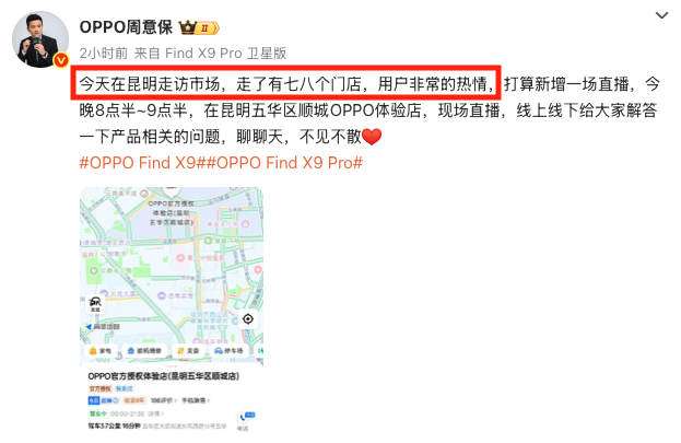 更有一段“幕后花絮”在圈内传开——OPPO Find 系列产品负责人周意保亲自前往昆明走访市场,一连走访了七八家门店。所到之处,用户热情高涨,不少都是前来体验新机、咨询功能的。