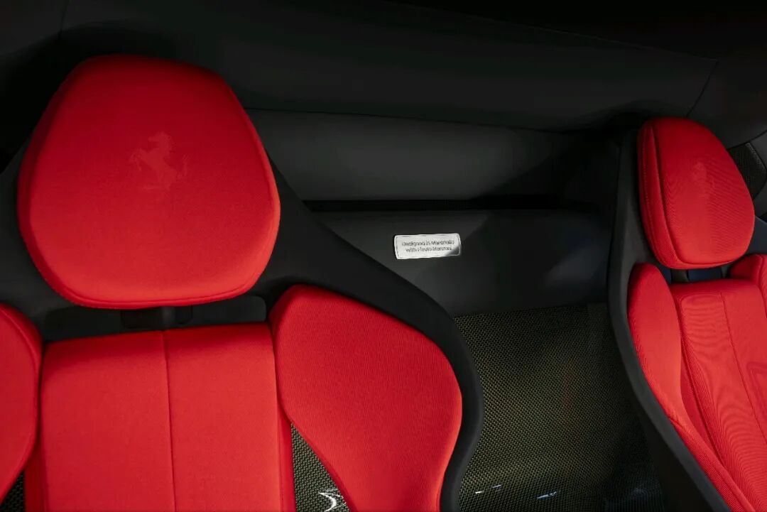 首先,脚踏板区域、座椅靠背、仪表板和方向盘饰件均由碳纤维凯夫拉材质制成,这种突破性材料曾是F40实现惊人轻量化的功臣之一。座椅上的红色提花织物是另一处复古细节,而黑色Alcantara材质则让人想起原版车型那简约的植绒仪表台。