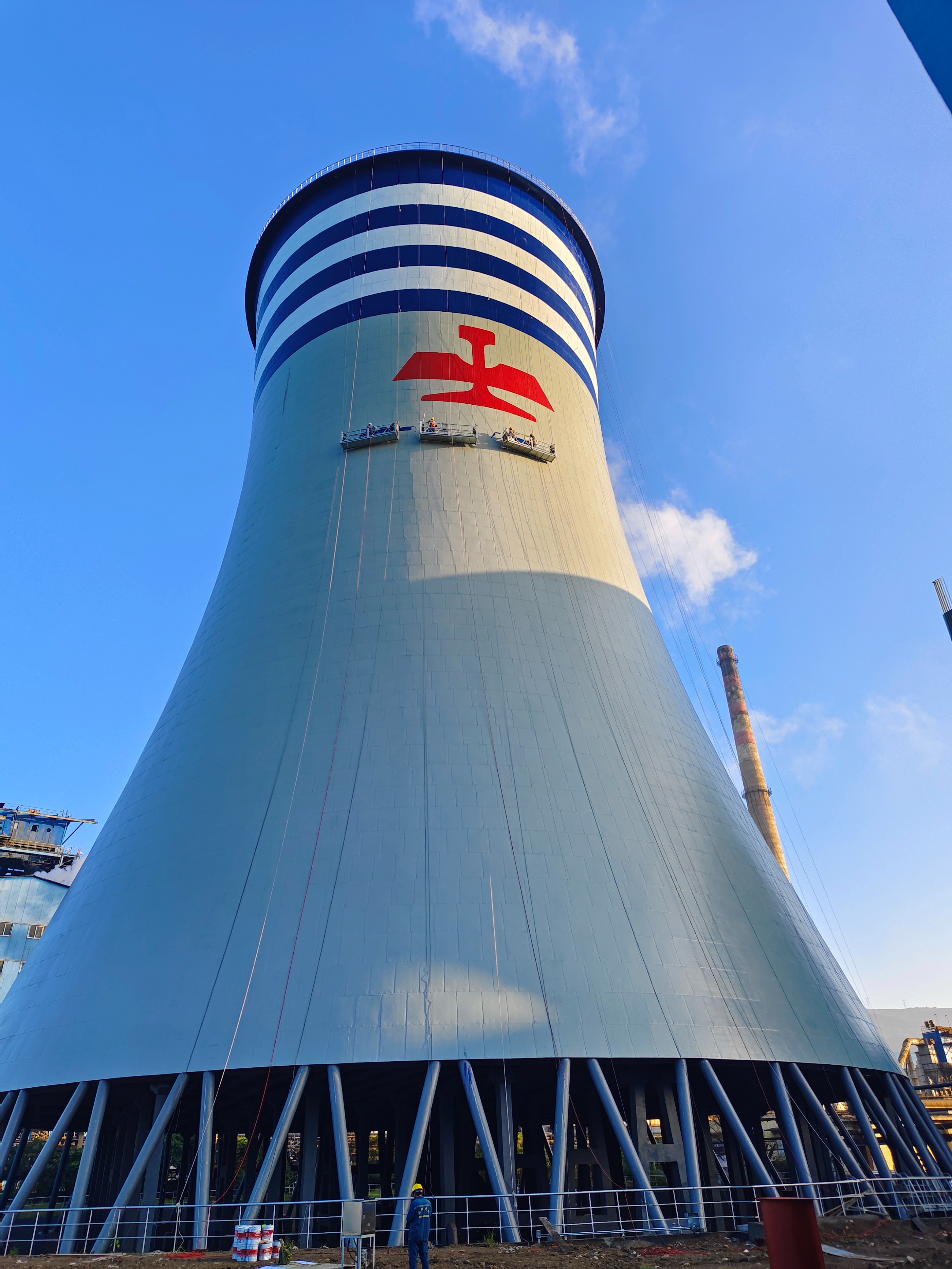 2. 安全与技术准备搭建全维度安全防护体系:冷却塔底部 30 米范围设置硬质隔离区,悬挂 “高空作业、禁止入内”“注意防尘、避让施工” 警示标识,作业区域下方铺设防坠物防护棚与防尘网;选用经检测合格的高空吊篮,作业人员持高空作业证、涂装工证上岗,岗前开展专项培训;组织技术交底,重点强调色环定位精度、涂料配比、涂刷厚度及边角处理技巧,明确不同基面的施工要点。