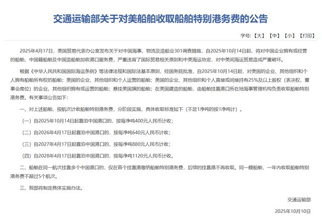 当然,中方的对等反制在这天也同时到来,除了对美国拥有、运营、建造的船只收取特别港务费,还对悬挂美国国旗、美国直接或间接持股25以上的企业或组织的船舶收取特别港务费,并且这个特别港务费是逐年递增的,今年是每净吨400人民币,2026年的4月17日起就是640人民币每净吨,2027年的4月17日起就是880人民币每净吨,2028年的4月17日起就是1120人民币每净吨。