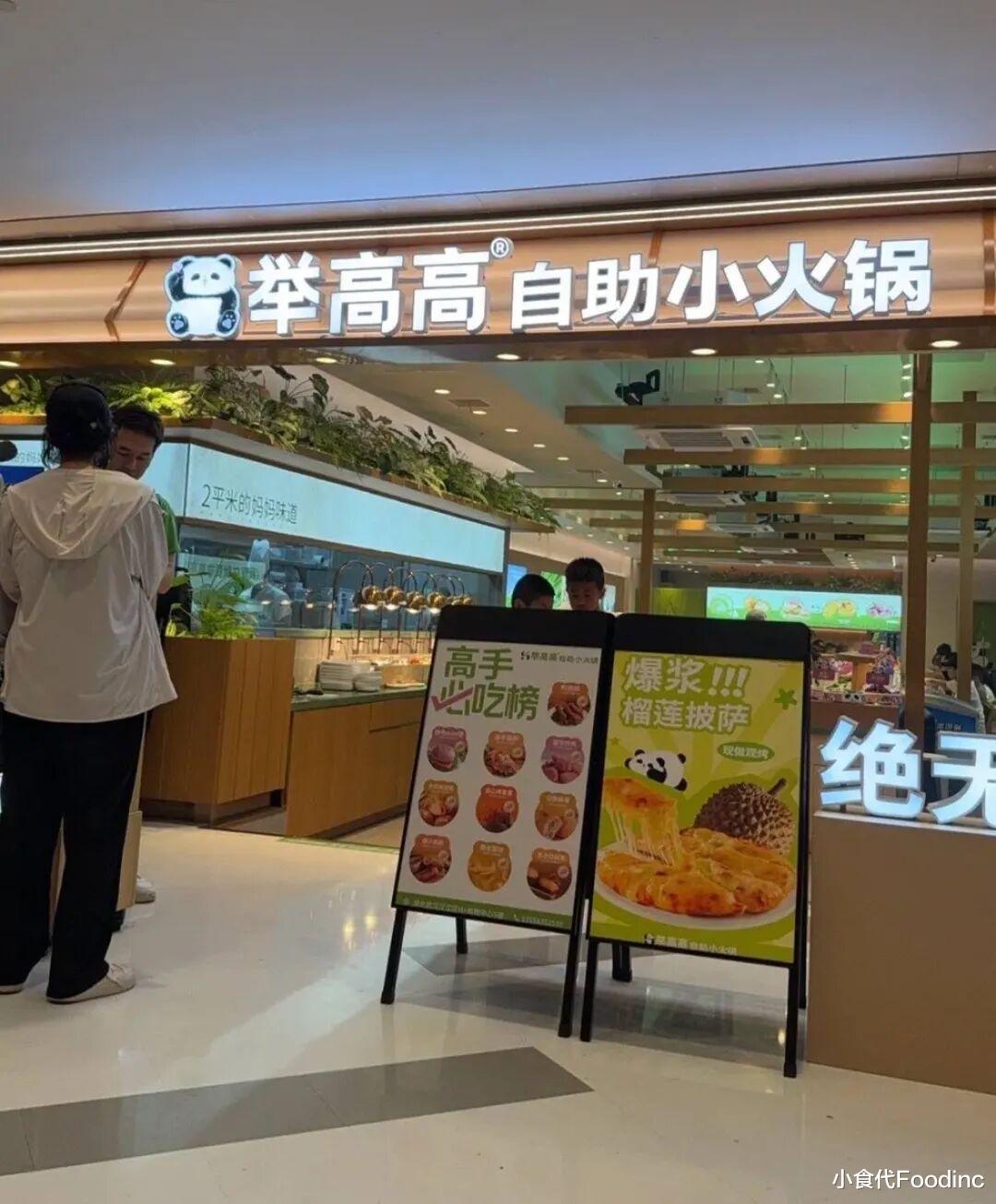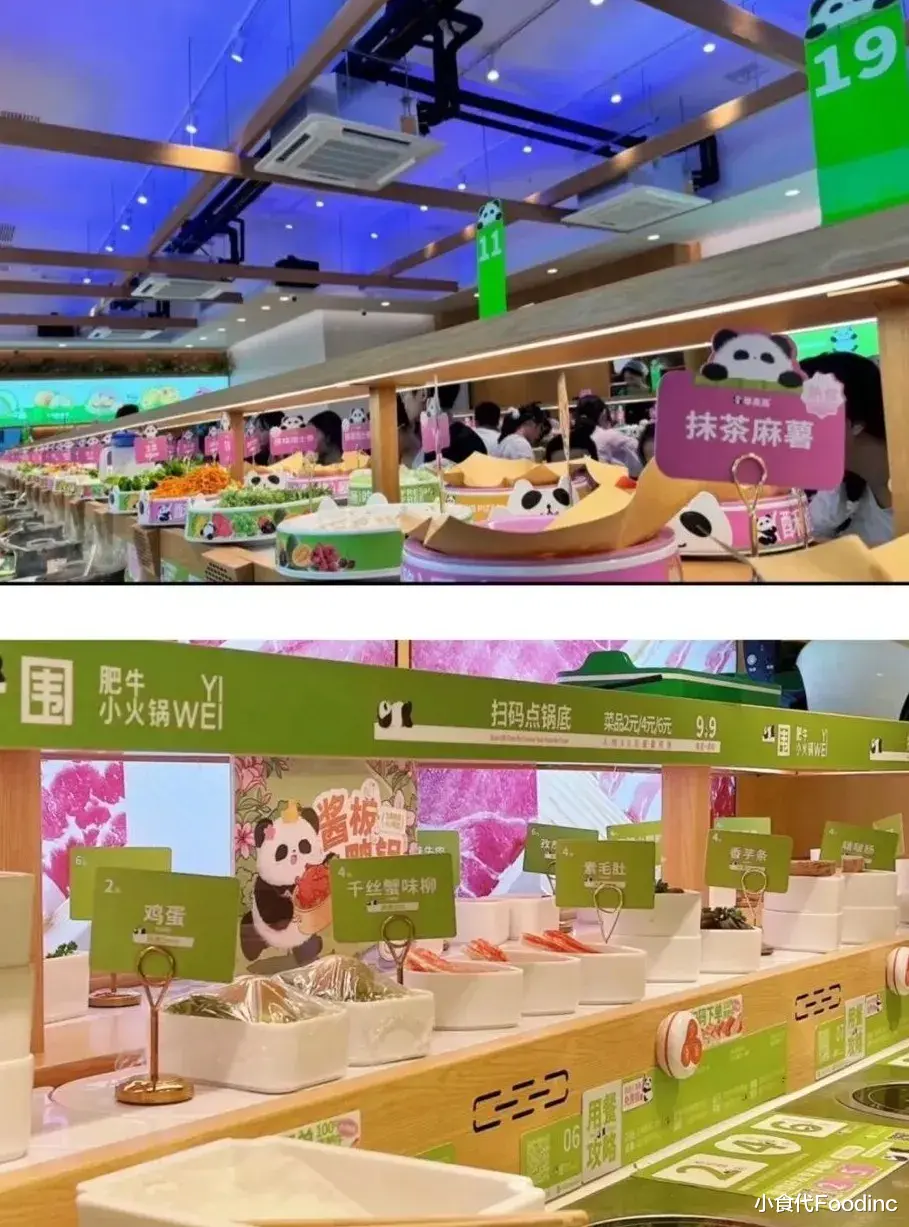 有趣的是,除了定价亲民,被海底捞收购的举高高与一围还有诸多相似之处。在品牌标识上,双方均采用萌宠风熊猫。在门店设置上,两个品牌均为一人一锅,主打自助式服务,如顾客需在面前的传送带自取食材。