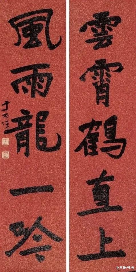 诸如下面的这幅榜书,却以一种清新的面貌示人,让人眼前一亮,其内容是“云霄鹤直上,风雨龙一吟。”。