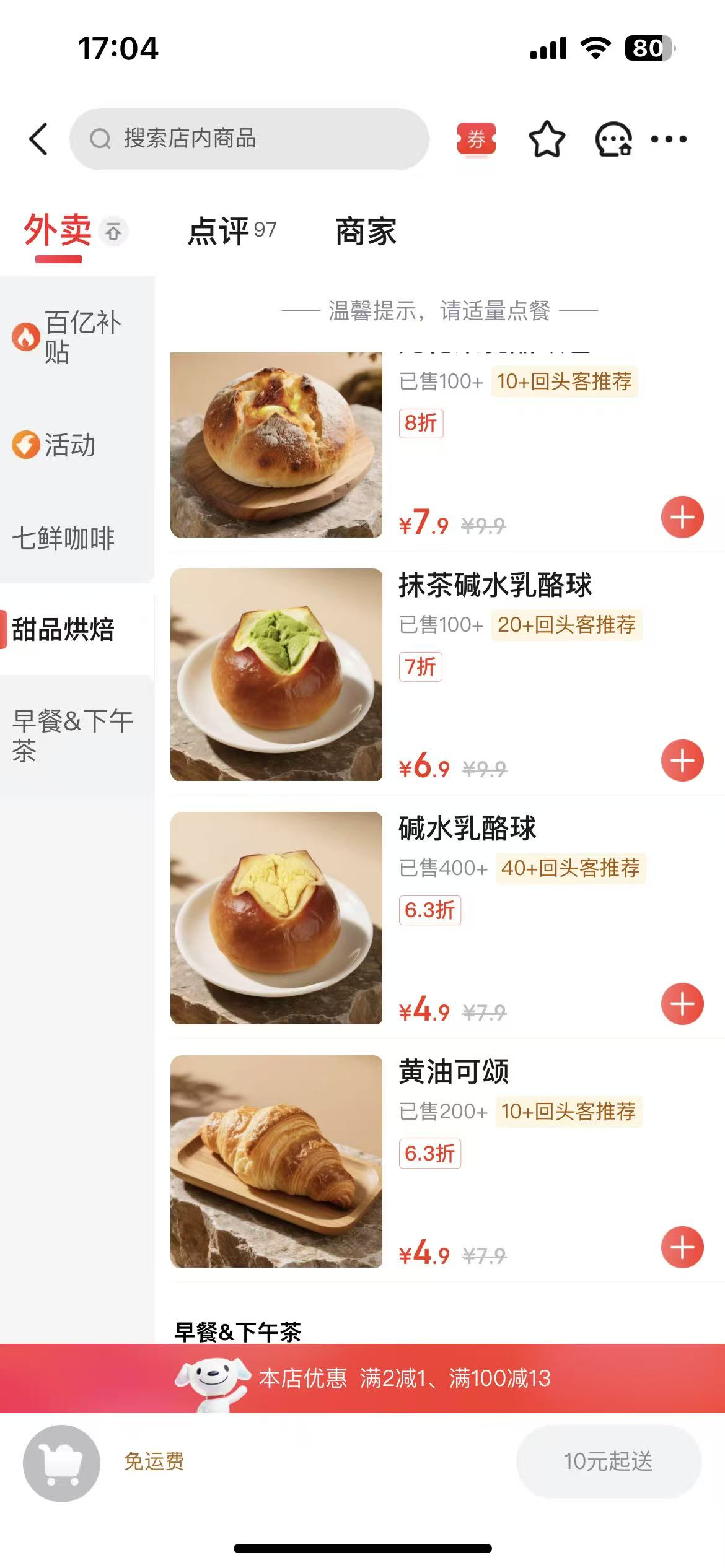 从产品看,七鲜咖啡的产品体系主要分:咖啡、甜品烘焙及早餐下午茶套餐,其中咖啡品类涵盖美式、拿铁等品类,分别有醇香美式、茉莉轻乳茶、轻椰茉莉冰茶、鲜奶拿铁、茉莉花香拿铁、生椰拿铁、椰青美式、双杯美式;甜品则有黄油提子司康、法式扁桃仁焦糖酥等热门烘焙面包产品。咖啡的定价仅为9.9元。但是在促销期间价格更低,只有5元到7元。比瑞幸和库迪更便宜。