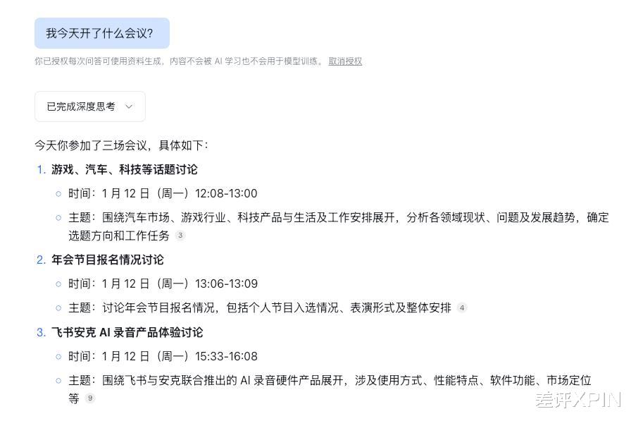 就比如我也可以用飞书的知识问答功能,来批量总结我几天前开会聊了什么。
