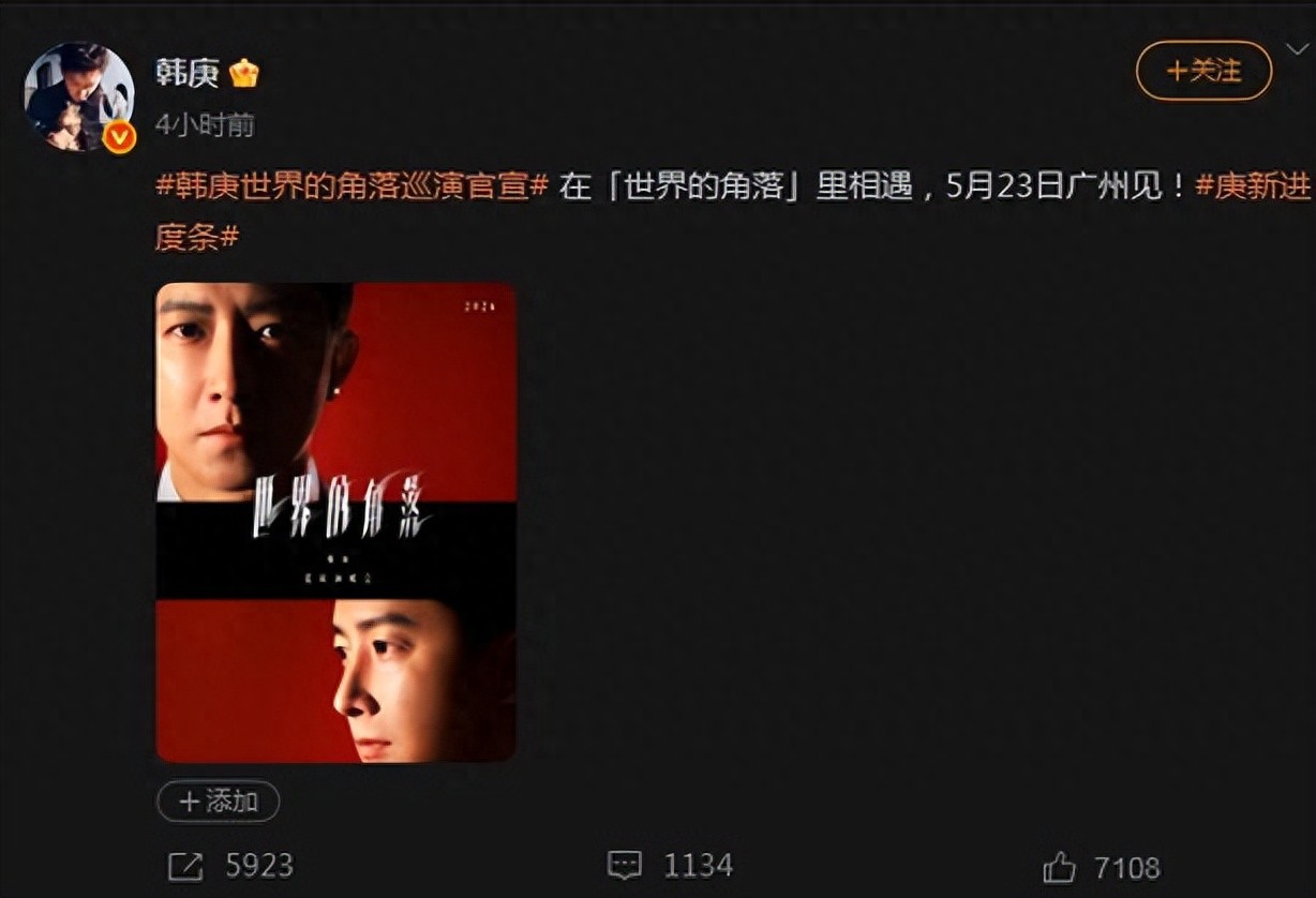 终于等到韩庚官宣巡演!首场5月53日广州站我一定要坐在内场!!小学就开始追庚哥,转眼当牛马都十年了,庚哥的舞台还是这么能打,跳舞实力从没拉胯,现场稳到离谱,当年循环舞台的日子还历历在目,现在终于能线下感受这份震撼了!已经开始疯狂倒计时了!