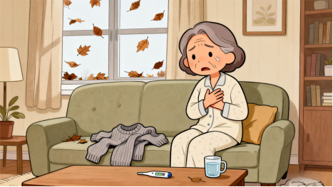 这周一早上,我刚起床就听见客厅里有动静,走过去一看,我妈正坐在沙发上,双手捂着胸口,脸色有点发白。我赶紧问她怎么了,她喘着气说:“不知道咋回事,一降温就心慌,刚才穿衣服的时候,稍微动快点,就觉得心脏‘咚咚’跳,还胸口发紧,缓了好一会儿才好。”