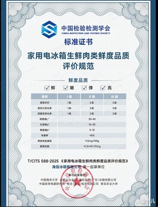 9月29日,由海信冰箱牵头制定的《家用电冰箱生鲜肉类鲜度品质评价规范》正式通过审定。这一团体标准的建立,首次为冰箱行业的“肉类保鲜”能力构建了一套科学、完整且可量化的评价体系,标志着家用冰箱保鲜技术从长期的概念宣传迈入科学实证的新阶段。