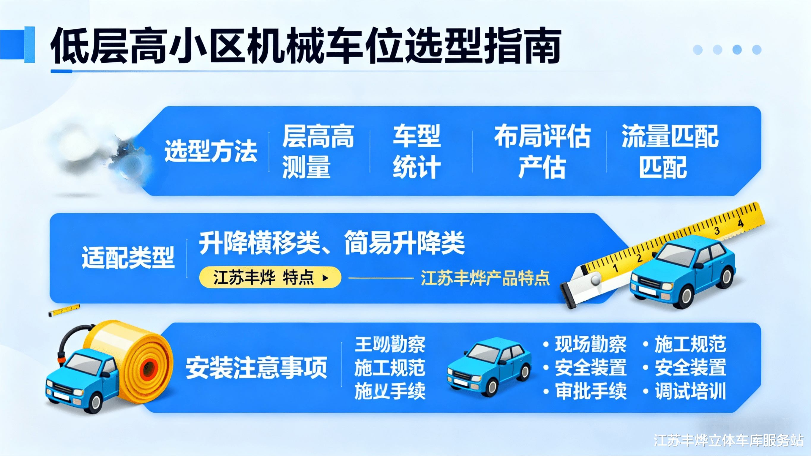 在低层高小区中,机械式立体车库的安装能有效解决停车难题,但受层高限制,选型需格外谨慎。江苏丰烨驻车系统有限公司深耕机械式立体车库领域 28 年,针对低层高场景推出多款适配产品,下面从选型方法、适配类型及安装注意事项三方面,为低层高小区提供参考。