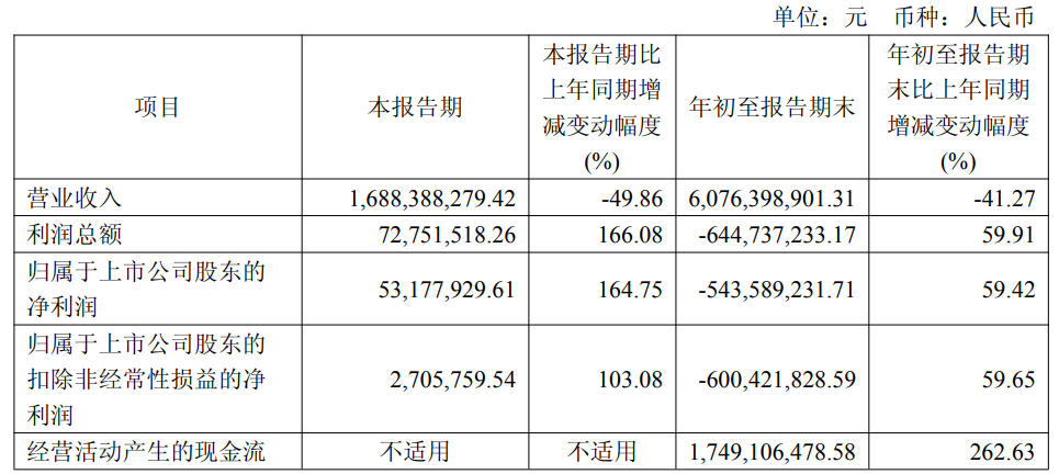 其中,公司第三季度营业收入16.88亿元,同比下降49.86%;净利润5317.79万元,同比扭亏。