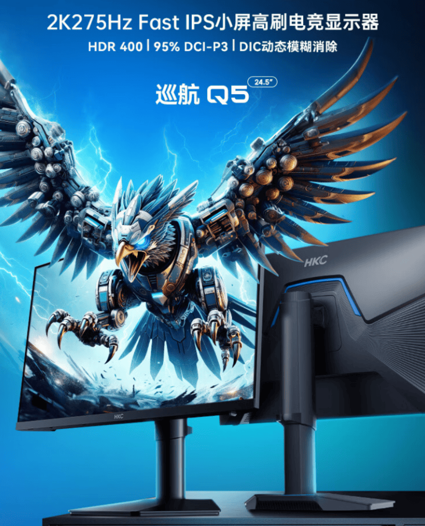 对于多数电竞玩家而言,“小桌面”与“高体验”似乎是一对天然矛盾:大屏电竞显示器虽沉浸感拉满,却会挤占宿舍、出租屋的局促空间;传统小屏显示器又常在分辨率、刷新率上妥协,难以匹配 FPS、竞速游戏的流畅需求。近日,HKC正式推出巡航Q5电竞显示器——以24.5英寸“黄金小屏”为载体,将2K高清、275Hz高刷、高色域面板等旗舰参数浓缩其中,更以999元的首发定价击穿同规格产品价格底线,为小桌面用户带来“鱼与熊掌兼得”的新选择。