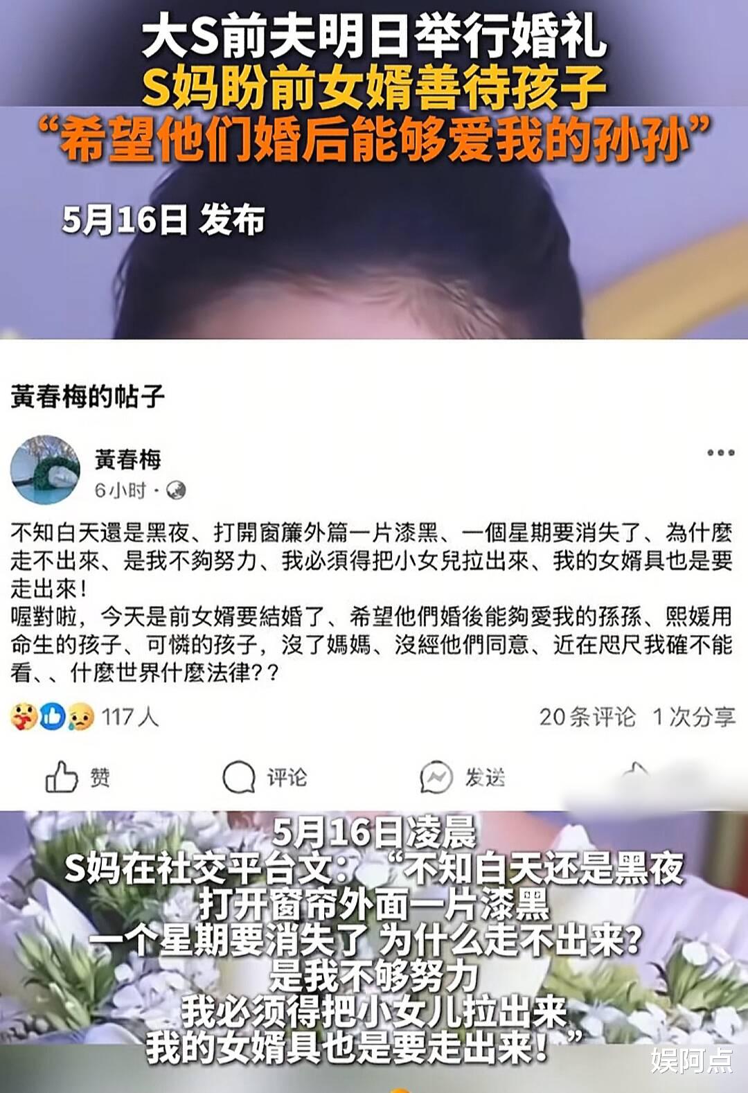 几家欢乐几家愁,汪小菲这边喜气洋洋迎新娘子,而S家则仍然处于悲伤的氛围中。5月16日的时候,S妈也正面回应了汪小菲大婚之事,没有任何祝福,只有不断地告诫,称希望汪小菲马筱梅婚后能够好好爱大S的两个孩子。