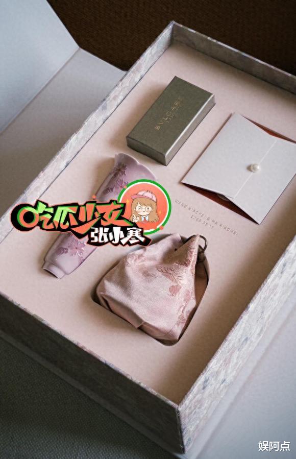 而巧克力下边则放了2个粉色印有花朵的小瓷杯,意味着“一辈子”,可谓颇用心了。另外两件物品虽然不知里面装的是啥,但想必也是颇有寓意的东西。