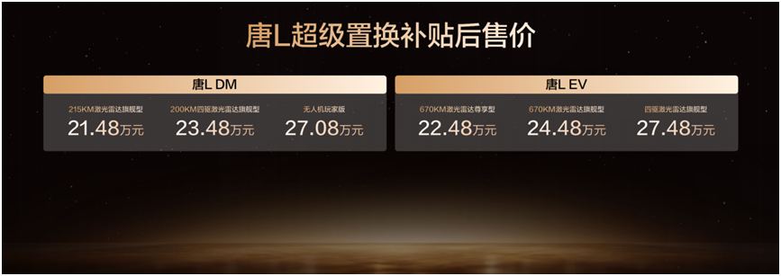 此次,唐L EV 3款车型,补贴后售价22.48万~27.48万元;唐L DM 3款车型,补贴后售价21.48万~27.08万元;同时,比亚迪还为用户准备了包含置换补贴在内的至高价值4.5万元尊享礼遇,让旗舰体验触手可及。